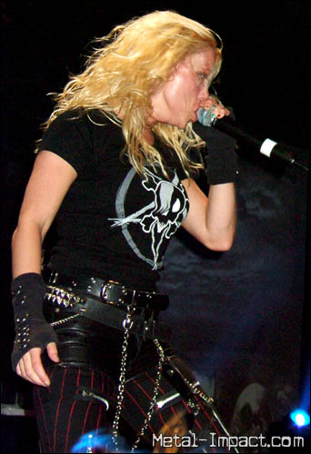 D’autant que nous voilà partis pour une grosse demi-heure d’attente. Ah, il a intérêt à être bon le son ! L’énervement commence à monter, en raison aussi d’une pseudo photographe particulièrement sans gêne. Incrustée tout devant depuis le début du concert, son sac dans mes reins m’a empêché de bouger pendant toute la première partie. De photographe elle n’a d’ailleurs que l’appareil. Que de moments superbes à shooter elle a raté parce que cette gourde vérifiait les clichés qu’elle venait de prendre ! Car en effet, c’est un très bon show que nous offre ce soir ARCH ENEMY (et, oui, le son était bon). Angela Gossow a du charisme et sa voix rauque nous fait vibrer. Le premier titre, Nemesis, nous met tout de suite en train et ça bouge sacrément dans la fosse. Les musiciens ont de la présence sur scène, se déplacent sans cesse sans pour autant prendre des pauses affectées, et la puissance de leur musique nous bat aux oreilles. La scène est sobrement décorée : une grande tenture à tête de mort portant le nom du groupe pour le fond, deux voiles représentant des paysages lunaires pour cacher le matériel. J’aime beaucoup la sécurité, un peu dépassée, essayant de repousser les slammers dans le public sans marcher sur les cheveux des headbangers… (7/10)