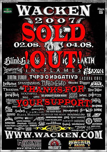 Record d'affluence tout d'abord, avec un sold out annoncé quelques jours avant le début des festivités ! Record d'attente pour atteindre le site en lui même... Nous avons mis 7 heures et quelques pour faire 5 kilomètres, en arrivant le mercredi ! Certains derrière nous ont dormi dans les voitures, l'autoroute bloquée, l'ennui et l'énervement étant parfois très proches, bref une bien mauvaise surprise... Heureusement, ils ont eu la bonne idée de donner les accréditations dés ce jour là (et non pas à partir du jeudi comme d'habitude), ainsi que l'ouverture du camping backstage, ce qui nous a fait gagné du temps et des soucis, à défaut d'avoir une ambiance typiquement wackenienne dans les campings C et alentours... Record de lenteur pour atteindre les scènes entre elles.. En effet pour la première fois, la party stage fut placée sur un champ annexe, mais pour l'atteindre, il fallait emprunter un passage bien étroit au vu du peuple présent, au fond à droite du site principal... C'était gavant au bout d'un moment, donc uniquement pour cette raison, je n'ai pas vu OVERKILL ou STORMWARRIOR, car le temps de regarder SAXON et IMMORTAL qui jouaient respectivement un peu avant chacun d'eux, il fallait ensuite fendre une foule compacte, et pas toujours amicale (une mauvaise première pour Wacken...), poireauter au passage le temps que ca s'écoule, et enfin espérer apercevoir le groupe du fond du champ. Pas top top...