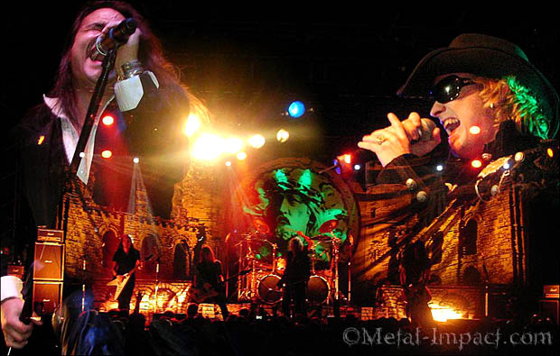 Lorsque H.E.A.T entre en scène, on se croit revenu vingt ans en arrière, la grande époque d'EUROPE, les débuts de FATE, ou l'explosion de SURVIVOR. Le tout avec les looks qui vont avec, brushing et costumes d'époque ! La surprise passée, l'appréhension de n'assister qu'à un tribute au hard fm de leurs idoles s'estompe aussi rapidement. Les suédois, s'ils s'inspirent largement de leurs aînés, remettent au goût du jour ces mélodies et ces rythmes entêtants, en y ajoutant de la puissance et de la fraîcheur. Emmenés par un chanteur surdoué, à la voix incroyable pour ses 22 ans, ces jeunes morts de faim vont faire grosse impression. Visuellement, c'est agréable, ça bouge, ça frise le ringard sans s'y engager tout à fait, ça donne envie, et fait plaisir à regarder. « Never Let Go » ou « Straight For The Heart » sont on ne peut plus engageant, et bien que le public ne participe pas beaucoup, ces titres enlevés vont contribuer à chauffer peu à peu la salle. Notons un super son pour une première partie. Une bonne surprise, à suivre de près.