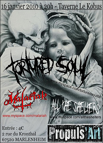 Je dois bien avouer que depuis un peu plus d’un mois maintenant, je redécouvre une facette du Metal que j’avais perdue du vue : les performances live ! Après FRAKTUR qui s’était rendu le mois dernier au Kobus de Marlenheim (en banlieue de Strasbourg), c’est cette fois MALARIAH accompagné de TORTURED SOUL et ALL THE SHELTERS qui a répondu favorablement à l’invitation de la toute jeune association Propuls’Art. L’endroit est le même et en l’espace d’une trentaine de jour, il n’a rien perdu de son sublime. La petite taverne qui jouxte la salle de restaurant à un charme tout particulier avec ses allures de caveau, mausolée de l’Underground Music et discothèque à ses heures. Et même si les sonorités cybernétiques de l’« Electro-tendance » viennent réduire à néant les neurones des fêtards tard dans la nuit, rappelons qu’il n’était ce jour-là que 20 heures 30 quand le concert devait officiellement commencer. Pas de risque à cette heure quasi-matinale d’entendre des séquenceurs détraqués venir couper l’élan de riffs engagés. Tant mieux puisque l’affiche proposée s’annonce prometteuse. L’inconnu règne concernant ALL THE SHELTERS mais pour les deux autres, c’est probablement le must du Death de la région strasbourgeoise qui s’est réuni autour d’une bière, si l’on occulte de parler de MOLOSSE, INHUMATE, ABSURDITY et les autres…