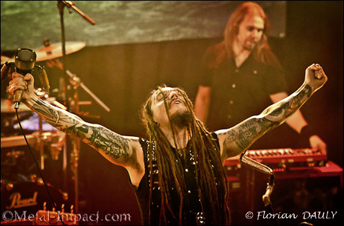 C'est dans une atmosphère devenue étouffante (tiens, un petit évanouissement dans la fosse justement ...) que les techniciens préparent l'entrée du très attendu AMORPHIS, qui n'était pas passé en France depuis plus de 2 ans. C'est donc 2h après l'ouverture des portes qu'AMORPHIS fait son apparition sur une scène brumeuse au son d'un de leurs nouveaux titres "Battle For Light" (The Beginning Of Times - 2011). Le dernier à rentrer sur scène est bien évidemment le très charismatique chanteur Tomi Joutsen. Des dreadlocks qui descendent à mi-cuisse, un splendide micro façon Steam Punk, nous sommes bien face à l'un des chanteurs de Metal les plus stylés du moment. AMORPHIS décide d'attaquer ce concert avec son nouvel album The Beginning Of Times en enchaînant "Song Of The Sage", "My Enemy" et "The Smoke". Le groupe paraît surpris que leur dernier opus soit si bien accueilli par le public. On pourrait même parler d'un réel enthousiasme de leurs fans qui connaissent déjà parfaitement les paroles.