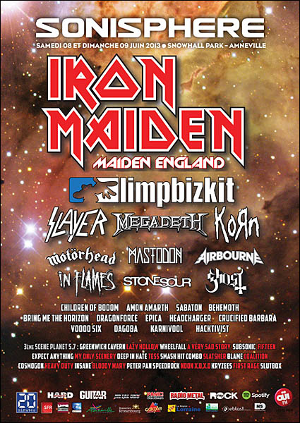 C’est sur qu’entre les gros soucis d’annulations et consorts de l’année dernière, une affiche qui peut parfois être sujette à débat, un choix de site peu commun pour un festival de ce gabarit et le désistement de TRUST cette année, le Sonisphère d’Amnéville donne depuis trois ans déjà l’impression de connaître toutes les situations possibles et imaginables : une première édition exceptionnelle (avec entre autre, la venu du Big 4), une édition 2012 plutôt cauchemardesque d’après ce que j’ai pu comprendre, et enfin, 2013. Alors qu’en est-il cette année ? Quand le 12 novembre 2012, l’organisation annonce que la tête d’affiche sera IRON MAIDEN, la perspective d’un festival grandiose paraissait tout à fait plausible… Et les autres noms, tous plus alléchants les uns que les autres, sont tombés petit à petit durant l’année, lentement mais surement : MEGADETH, SLAYER, STONE SOUR, AIRBOURNE, IN FLAMES, EPICA… Le vrai point fort de cette affiche résidait cette année dans une diversité des groupes proposés et un éclectisme pointu (franchement, qui s’attendait à voir un groupe si peu « mainstream » comme BEHEMOTH au Sonisphère ?).