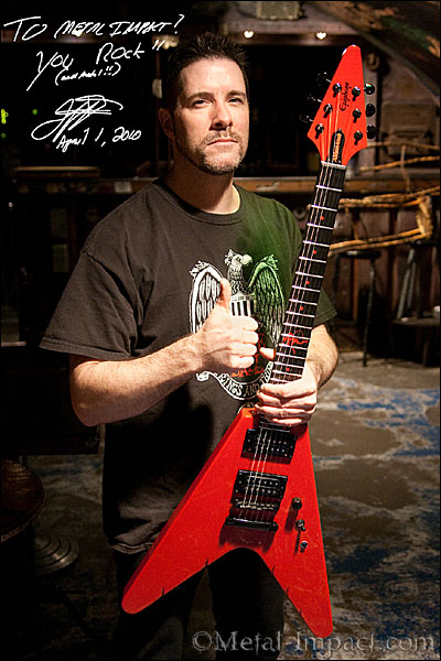 Jeff. Yeah, the new one is more tied together, I mix it, all the guitars are exactly the same guitars, the same amps, the same microphone, everything the same, so that was the mix for every song, and that makes your brain hear it the same. Same with the bass, the drums, the snare drum was the same on all the album, the same vocal microphone, many bands change the vocal microphone for different songs, use different cymbals, and snare drums, but I made everything the same, so the listener will hear one song, then the next, and think that they are part of the same thing, but they’re not! !In the older days, what I would do, is that each song will have a different microphone, a different guitar, different sounds…I also mix it very loud, a little more modern, and Dave PADDEN the singer for some reason sung with a little more aggression. So I think all of a sudden now, our album, like you said it’s baam! (Jeff hits the table with his fist). It’s easier for the listener to hear our sound. Like all the songs have something common. Yeah, the chords are pretty easy to remember even if they are Metal. But then again, the first song, “The Trend”, is three minutes solo, 18 guitars! I like that song, my friends and co manager didn’t want that song to be the opening, but I said no. As soon as it starts, the first thing you think is “eighties”, you are back in the 80’s. That’s what I think. If you’re older than 35 years old, 30 years old, you will say, “Uh, that’s the 80’s”, back to 1983! My partner said to me, “You can’t want it as a first song, because it’s not singing for three minutes!”, and many songs are finished in three minutes! But I don’t care, I’m not trying to be played on radio, I’m not trying to oppress anyone, I’m not trying to sell records! I find it cool to start my album with...like…”Hey man, I play guitar you know! I don’t need a fucking singer, I’m just playing Metal guitar!”.