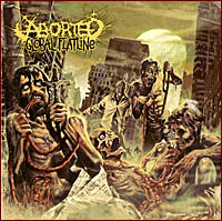 Qui dit nouvel album d’ABORTED dit forcément nouveau line-up. Parmi mes pléonasmes préférés, il y a le sel salé et celui-là. On ne s’épanchera pas davantage sur ces énièmes changements de musiciens qui sont un évènement pour certains groupes et une mauvaise habitude pour nos amis belges. Bienvenu donc à Ken Bedene (batterie) et Mike Wilson (guitare), deux anciens de la maison ABIGAIL WILLIAMS ainsi qu’au bassiste J.B Van Der Wal. Voilà pour le discours ritualiste. Sinon, l’actualité pour ABORTED, c’est surtout Global Flatline, un septième album studio qui succède au tristounet Stychnine.213 paru en 2008. Pour ce nouveau brulot, à en juger cette pochette très réussie, on pourrait en toute logique s’attendre à un retour aux sources, à une sorte de désaveu du Brutal Death Metal faussement mélodieux et diviseur servi depuis Slaughter & Apparatus : A Methodical Overture. Dans cette partie de poker menteur, ABORTED a décidemment le don de déjouer les pronostics. Car quoi qu’on puisse en penser, Global Flatline sera dans un futur proche la consécration de quinze années d’une carrière prospère. C’est un album démentiel qui résume les six précédents et qui pourtant, ne ressemble à aucun d’entre eux. C’est une création libre et indépendante, qui porte le sceau ABORTED encore fumant et qui malgré ça, est généreux comme une première fois.