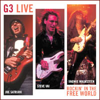 Le G3 est à la guitare ce que l’oktoberfest est à la bière : la célébration dans la démesure ! Avec la réunion des trois survivants des années 80, les fans de guitare vont être comblés au delà de leur attente. La présence de Malmsteen apparaît même comme un miracle tant l’ego et le caractère bouillonnant du maître suédois pouvaient compromettre un tel projet. Heureusement, le rêve est devenu réalité, et il se concrétise aujourd’hui par un live de très bonne facture qui retranscrit la personnalité de chacun : la précision mathématique de Satriani, la fantaisie expérimentale de Vai et la tornade néo-classique de Malmsteen. Ces différentes facettes se fondent avec osmose lors d’un jam final époustouflant composé de 3 titres dont 2 reprises de Hendrix.