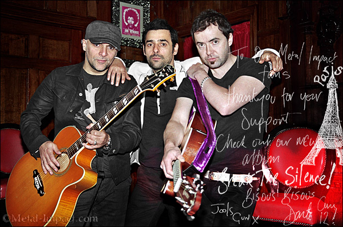 GUN, un nom qui ne vous évoque surement rien ou presque, seuls peut-être quelques grognards issus du siècle dernier se souviennent de cette formation unique qui explosa littéralement les neurones de nombreux métalleux à l’aube des années 90! Pourtant, nos vétérans auraient pu faire partie de l’élite du Rock et devenir un nom incontournable de la scène internationale. Ils étaient incontestablement de la race des seigneurs, de ceux qui galvanisent des stades entiers et font frémir toutes les demoiselles qui ne peuvent que hurler de plaisir en les voyant fouler les planches. Mais malheureusement, le destin en a décidé autrement et le rêve s’est transformé en cauchemar. Issus de Glasgow en Ecosse, le combo s’est formé en 1987 alors que le Hard Rock anglais et américain explosait littéralement au niveau mondial et dominait les stades. Très vite, les bougres signaient sur une major et s’imposaient avec l’album Taking On The World qui, d’emblé, leur permettait d’ouvrir pour les ROLLING STONES sur le Urban Jungle Tour en 1990. De quoi en faire rêver plus d’un. Et comme si cela ne suffisait pas, nos écossais s’offraient aussi le luxe de tourner avec BON JOVI et DEF LEPPARD. Un feu d’artifice qui leur ouvre un boulevard vers les charts. La deuxième galette, Gallus, s’avère de bonne qualité mais ne confirme pas tous les espoirs qu’avaient suscités le gang mais leur permet de maintenir le navire à flot. Malgré des difficultés internes, le guitariste et le batteur abandonnent le vaisseau juste avant la sortie de Swagger. La galette est un énorme succès et prouve que le combo n’est pas mort et sait encore faire parler la poudre. Le single « Word Up », une reprise de SIMPLE MIND, se hisse à la dixième place des Hits en Angleterre et est élu par MTV comme la meilleure reprise de l’année 1992. GUN est à son zénith et rien ne semble plus pouvoir les arrêter dans leur course effrénée vers le succès. Il faut dire que l’opus est gorgé de pépites accrocheuses qui font le bonheur de tous les programmateurs. Pourtant, alors que tout semble leur sourire, les GUN décident alors de faire un break de trois ans pour une raison qui demeure ancrée dans les méandres secrets du business et qui s’avérera totalement suicidaire. Le retour s’avère des plus difficiles pour nos écossais, d’autant plus que nos lascars, pour des raisons obscures, ont aussi décidé de changer de nom: GUN se transformant en G.U.N. pour la circonstance. Une décision étrange qui se soldera par une incompréhension totale des fans qui commenceront à bouder nos rockers. Les changements incessants de musiciens les ont, de plus, fragilisés et le nouvel opus « 0141 632 6326 », produit par Andrew Farriss le clavier d’INXS est loin de faire l’unanimité et s’avère catastrophique en terme de vente. Un échec dont les GUN ne se remettront jamais et qui provoque le split définitif en 1997. Il faudra alors attendre de longues années avant d’avoir des nouvelles des petits gars de Glasgow. C’est en 2008 que le monstre se réveille et donne enfin de ses nouvelles suite à une récompense qui les a élus meilleur groupe live écossais de l’année. De quoi vous regonfler à bloc. L’occasion était trop belle et nos garçons en profitent pour enregistrer un EP, Popkiller. Ils partent en tournée en special guest de LYNYRD SKYNYRD sur leurs dates anglaises. La machine infernale était lancée sans que rien ne puisse les arrêter, même pas le départ du chanteur Toby Jepson, le remplaçant de Mark Ranckin, qui décide de jeter l’éponge après quelques années de bons et loyaux services. Cette fois-ci, la solution est radicale, c’est Dante Gizzi qui abandonne la basse pour passer au chant. Quelle idée lumineuse! Avec un line-up enfin stable, les bougres en profitent pour travailler sur de nouveaux titres et quelques mois plus tard, Break The Silence arrive dans les bacs pour notre plus grand bonheur! Car la galette est une réussite et s’avère être dans la lignée de Swagger , une forme de retour aux sources qui ne peut qu’enchanter tous les hussards qui les suivent depuis le début. Pour couronner le tout, les GUN partent en tournée européenne avec THE CULT. De quoi réjouir tout le monde. C’est à la veille de leur concert parisien au Bataclan que Metal Impact a pu rencontrer les GUN. Les deux frères Gizzi, dans une forme éblouissante, ont bien voulu se prêter au jeu des questions-réponses pour notre plus grand plaisir! Une discussion des plus sympathiques avec deux musiciens de talents qui manifestement étaient heureux d’être à Panam pour papoter et tout nous révéler sur leur nouvel opus et sur bien d’autres sujets! Avec en prime un mini show acoustique comme hors d’œuvre, MI était dans des conditions idéales pour en savoir un peu plus sur ce grand retour! Magnéto Dizzi’s brother connection !