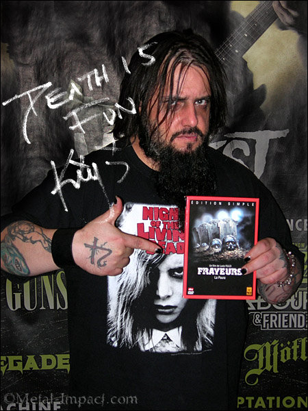 Frank "Killjoy" Pucci. Quand tu joues dans un festival comme le Hellfest, cela te permet de toucher un large public, mais, d'un autre côté, tu n'es pas forcément accompagné de ton propre ingé son ni de tes décors de scène. Or, il me semble important pour NECROPHAGIA d'être en mesure de développer tout le côté visuel qui va avec sa musique. Sur scène, tu retrouves certes une énergie particulière mais je me sens un peu frustré, lorsque je me produis dans un festival, de ne pas pouvoir mettre notre musique en images, d'autant que, étant fans d'horreur, notre musique est très « imagée ».