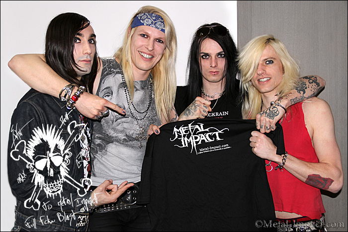 L’histoire de BLACKRAIN ressemble un peu à un véritable conte de fée. Le parcours est parfait et pourrait servir d’exemple à de nombreux groupes français. Un mode d’emploi idéal pour tous les musiciens qui ont décidé un jour de jouer du Rock’n’roll aux quatre coins du monde. Dix longues années auront été nécessaires pour atteindre leurs rêves ! L’aventure commence en 2002 en Haute Savoie à Annecy plus exactement, pas vraiment la patrie du Metal. Deux copains, Swan Hellion (Chant/Guitare) et Max 2 (Guitare) tous deux fans de MOTLEY CRUE, WASP ET GUNS & ROSES décident de monter leur combo, ce sera BLACKRAIN. Leur rencontre avec Kenny Snake (Batterie) et Math (Basse) sera décisive, les Glameurs n’étant pas légion dans la région. Tout va ensuite s’enchainer très vite, les lascars se mettent à composer d’emblé leurs propres morceaux et déboulent en 2004 avec leur première démo : Twilight, Rain and Darkness devenu collector depuis. Un premier pas qui va leur servir de carte de visite. Il faudra encore attendre deux ans avant que nos savoyard sortent leur première offrande sobrement intitulée BLACKRAIN. Une véritable surprise qui vient du fait qu’on est encore loin du BLACKRAIN d’aujourd’hui, le combo officiant plutôt à cette époque dans un Heavy Power Metal. Si musicalement nos glameurs sont encore hésitants, on sent déjà chez eux un fort potentiel qui ne demande qu’à exploser. A la même époque, nos amis partent en tournée au Japon pour une vingtaine de dates grâce à un de leurs amis qui leur propose une opportunité qu’ils ne peuvent refuser. License To Thrill marquera une étape décisive, les Sleasers trouveront leur véritable style et se donneront les moyens d’obtenir le son qu’il faut. Pour cela ils n’hésitèrent pas à aller enregistrer en Suède au Polar Studio. La pépite fut produite par Chris Laney qui a travaillé avec de nombreuses formations allant de EUROPE à CRAZY LIXX en passant par CRASHDIET ; une référence qui va leur permettre de faire un pas de géant dans l’hexagone et en Europe. La machine est lancée et nos killers vont en profiter pour tourner intensivement à travers l’Europe. L’hexagone ne sera pas épargné et le combo commencera à se forger une solide réputation scénique auprès d’un public de plus en plus nombreux. La rencontre en 2010 avec Dany Terbèche marquera un tournant décisif dans l’essor de BLACKRAIN, l’homme deviendra très vite le sixième membre de la formation qui agira dans l’ombre pour le plus grand bien de BLACKRAIN. Les bad boys quittent alors leur région natale pour s’installer au cœur de la capitale, lieu stratégique pour espérer passer dans la catégorie supérieure. Le changement est radical, les bougres s’offrent des premières parties de prestige allant de ALICE COOPER, EUROPE en passant par SCORPIONS. Le 14 février 2011 sort leur troisième opus, Lethal Dose Of… une vraie réussite qu’ils célèbreront par une tournée acoustique d’une vingtaine de dates à travers toute la France. Un concert complet à l’Alhambra sera le point d’orgue de cette année riche en évènements. Cette fois-ci, rien ne peut arrêter nos provinciaux en quête de succès, une soif de réussite omniprésente qui leur colle à la peau. Ce qui les caractérise c’est une volonté et une détermination impressionnante qui va leur permettre, au fil du temps, de s’imposer comme un des leaders de la scène française. Ils ne reculent devant aucun sacrifice pour imposer leur Rock’n’Roll et conquérir de nouveaux territoires encore inconnus. 2013 sera l’année BLACKRAIN, un véritable tsunami Glam qui va ravager tout sur son passage. Cette fois-ci, rien ne sera laissé au hasard, ils choisissent de travailler avec une légende de la production, Jack Douglas (AEROSMITH, CHEAP TRICK, ALICE COOPER, JOHN LENNON…) qui collectionne les disques de platine et qui n’hésitera pas le moins du monde à venir à Paris pour travailler sur la production des nouveaux morceaux ! Un véritable honneur quand on connait le palmarès hallucinant du bonhomme ! Un signe qui ne trompe pas notre américain ayant littéralement craqué sur les petits frenchies ! L’année 2012 sera consacrée à l’écriture et l’enregistrement de leur nouveau brûlot : It Begins, un nom parfaitement en phase avec leur destinée. D’emblée le ton est donné, il faudra compter sur BLACKRAIN en 2013, cette pépite prouve que BLACKRAIN est capable de prendre des risques et d’évoluer, il suffit d’écouter « Re-Revolution », « Nobody But You » ou encore Young Blood pour comprendre que le combo a plus d’un tour dans son sac et que l’avenir s’annonce radieux. Comme si cela n’était pas suffisant, les BLACKRAIN n’ont pas hésité à participer à l’émission La France à un Incroyable Talent, une idée de génie qui leur permit de présenter leurs nouvelles compositions à un public qui ne les connaissait pas et qui n’était pas forcément habitué aux décibels à haute dose. Le risque était bien présent et le challenge risqué, pourtant à la stupeur générale nos Rockers se retrouvèrent propulsés en finale, une vraie réussite ! Une véritable déflagration dans le paysage audiovisuel français qui, après la stupéfaction et l’interrogation, aboutira tout de même à une sixième place, de quoi se réjouir ! Les répercussions furent énormes et vont changer à jamais le destin de nos rockers savoyards. Après cette expérience unique pour un groupe de Metal, le gang en profite pour signer dans la foulée avec la major : Colombia/Sony qui fut, après ce dernier éclat, convaincu du potentiel international de nos garçons, un fait assez rare pour un groupe français ! Autant vous dire que MI était sur la pole position pour en savoir un peu plus sur ce parcours incroyable qui a vu quatre enfants du terroir de notre beau pays se retrouver en quelques années p