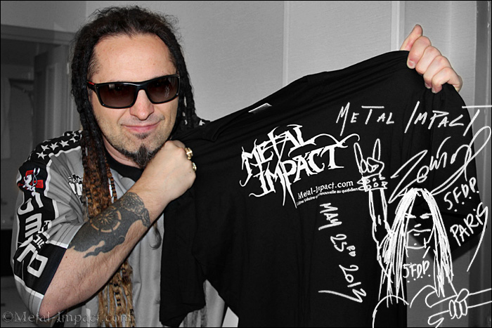 FIVE FINGER DEATH PUNCH demeure encore relativement méconnu en Europe et plus particulièrement en France mais plus pour très longtemps ! Heureusement, il n’en est rien outre Atlantique, bien au contraire. Le combo y a rencontré un énorme succès dès ses premiers méfaits et est devenu, au fil du temps, un gang incontournable de la scène US. Pourtant rien n’était gagné d’avance quand on regarde le parcours incroyable de son leader Zoltan Bathory. Si nos lascars sont basés aujourd’hui à Los Angeles, c’est en Hongrie que commencent véritablement les balbutiements du groupe. Zoltan y voit le jour et c’est de ces terres européennes qu’a germé l’idée de créer un combo qui allait, bien des années après, ravager le continent US grâce à un Metal mélodique doté de riffs assassins qui font mouche à chaque fois. Après s’être exilé à Los Angeles, le bougre, après bien des aventures, s’associe avec Ivan Moody, hurleur notoire, pour donner naissance à FIVE FINGER DEATH PUNCH en 2005. Un nom à dormir dehors qui fait référence au cinéma de Kung Fu Hongkongais dont le garçon est très friand. En 2006, nos californiens enregistrent leur premier opus The Way Of The Fist qui sera finalement distribué en 2007 par le label Firm Music. Tout va ensuite très vite et nos killers se retrouvent en tournée US avec KORN, MACHINE HEAD ou encore SLIPKNOT. Un début des plus prometteurs qui leur permet de conquérir un public de plus en plus vaste. Alors que leur première galette est certifiée or, les Rockers déboulent en 2009 avec War Is The Answer, produit par Kevin Churko (OZZY OSBOURNE), un maitre de la production. Un véritable tsunami métallique qui va les propulser tout en haut des charts avec des singles comme Hard To See ou Walk Away pour n’en citer que quelques uns. S’en suivit une énorme tournée au pays de l’oncle Sam accompagnée de SHADOWS FALL et OPETH, qui ne fit que confirmer qu’il fallait désormais compter sur eux. L’Europe ne fut pas délaissée pour autant puisque le Shock And Raw tour dévasta la plupart des territoires du vieux continent. Les grands festivals (Rock Am Ring, Rock Im Park, Download Festival) ne furent pas épargnés, les FIVE FINGER DEATH PUNCH prouvant ainsi qu’ils n’étaient pas là pour faire de la figuration en délivrant des shows plus intenses les uns que les autres. En mars 2010, le gang s’embarque pour 10 concerts en Irak pour soutenir les troupes américaines alors en pleine guerre. Une initiative qui fera couler beaucoup d’encre mais ne déstabilisera pas le moins du monde les FIVE FINGER DEATH PUNCH. L’année 2010 sera celle de leur consécration. Là encore, ils inondèrent le marché américain de nombreux singles, un matraquage en règle qui finit par porter ses fruits, du grand art ! Après un tel succès, pas question de laisser trainer les choses, le groupe s’enferme une nouvelle fois en studio avec Kevin Churko pour donner une suite à War Is The Answer : ce sera American Capitalist qui atterrira dans les bacs le 11 octobre 2011 ! Une nouvelles fois, les ventes s’envolent et les Bad Boys sillonnèrent les Etats Unis de long en large pendant une bonne partie de l’année 2012. Alors qu’on s’attendait à ne pas les revoir pendant quelques mois, le combo déboule avec une surprise de taille, un double album au nom étrange de The Wrong Side Of Heaven And The Righteous Side Of Hell où les invités sont légions et non des moindres puisque Rob Halford The Metal God en personne vient les accompagner sur le titre Lift Me Up ! Un vrai mystère qui ne pouvait qu’intriguer l’équipe de Metal Impact ! C’est muni d’une pléiade de questions que votre serviteur se dirigea vers l’antre parisienne des FIVE FINGER DEATH PUNCH afin d’en savoir un peu plus sur cette nouvelle offrande gargantuesque. C’est Zoltan Bathory le guitariste fondateur qui accepta de passer à la question ! Le garçon s’avère être un personnage intéressant et attachant. Bien loin de tous les clichés qu’on pourrait se faire, le guitariste est d’emblé très loquace, un vrai bonheur pour MI. Magnéto Zoltan !