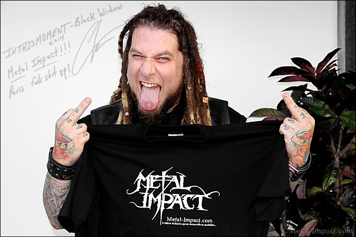 IN THIS MOMENT est encore relativement inconnu en France. Il faut dire que le combo américains n'a donné qu'un seul concert dans notre beau pays il y a maintenant sept longues années et n'est depuis jamais revenu fouler les terres françaises. Si le gang a encore tout à prouver dans l'hexagone, il n'en est pas de même aux USA ou depuis la sortie de Blood la formation s'impose au pays de l'oncle Sam d'une manière exceptionnelle. Le charme et la beauté de Maria Brink n'y étant pas pour rien. Mais au-delà de sa plastique très avantageuse, la belle s'avère être une véritable artiste qui s'épanouie totalement depuis la sortie de Blood, elle apporte cette magie supplémentaire dont le gang avait besoin et qui fait toute la différence. Car IN THIS MOMENT à déjà quatre opus à son actif et s'apprête à publier son cinquième méfaits Black Widow. Le chemin a été long et sinueux pour ce combo issu de la petite ville d'Albany dans l'état de New York. Formé en 2005 à l'initiative de Chris Howorth et de Maria Brink, il faudra de nombreuses années pour que nos américains trouvent leur identité musicale. Un long parcours ponctué de très bons albums comme the Dream ou A Star-Crossed Wasteland qui leur ont permis de tourner avec des légendes comme Ozzy Osbourne ou MEGADETH. Alors que tout semblait aller pour le mieux, Blake Bunzel le guitariste et Jeff Fabb le batteur quitte le combo sans crier gare. Un véritable séisme pour IN THIS MOMENT qui aurait pu leur être fatal, les deux musiciens étant là depuis les balbutiements de la formation. Dans la même période, ils sont lâchés par leur manager Blasko un autre coup dur qui aurait pu sonner le glas de IN THIS MOMENT. Ces défections successives auront un impact décisif sur l'avenir de IN THIS MOMENT. Maria Brink et Chris Howorth se retrouveront seul pour écrire ce qui allait devenir Blood accompagné du fidèle Kevin Churko qui leur sera d'une aide précieuse que ce soit au niveau de la production ou de la composition des nouveaux morceaux. Ce nouveal opus marquera une évolution décisive en introduisant des éléments modernes et électro qui leur permettront de squatter les charts à travers tous les USA. Un véritable succès qui va se traduire par une tournée démentielle ou les shows vont devenir de plus en plus spectaculaire, un évènement inspiré par des légendes comme KISS ou Alice Cooper. Maria devenant rapidement l'attraction principale des concerts grâce à sa prestance scénique exceptionnelle de plus en plus délirante alliée à un charisme hors du commun. Le show sera d'ailleurs immortalisé en avril 2013 lors d'un concert à Madison et sortira sous le doux nom Blood At The Orpheum. Après deux années passé à défendre Blood sur les routes avec des shows de plus en plus dithyrambique, les mêmes protagonistes reprennent le chemin des studios afin d'enregistrer leur cinquième galette Black Widow. Kevin Churko est une fois encore mis à contribution devenant ainsi au fil du temps un peu le cinquième membre de IN THIS MOMENT. Le processus créatif sera long et difficile, la pression étant palpable suite à leur signature avec la major Atlantic qui attend énormément de ses petits protégés. Mais les efforts et les dures heures d'angoisses seront payants, Black Widow étant un disque résolument moderne baignant dans une ambiance électro propice à séduire de nouvelles légions de fans et à squatter les charts des ondes américaines. Profitant de la venue dans la capitale de Maria Brink et de Chris Howorth, votre serviteur en a profité pour passer au grill le guitariste et fondateur de IN THIS MOMENT. Rencontre avec un musicien sympathique conscient de l'importance de Black Widow et prêt à conquérir la planète ! Magnéto Chris, c'est à toi !