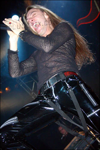… Au contraire de Manticora, groupe de Power Metal danois, peut-être peu connu encore (bien que quelques fans aient réalisé une banderole que le groupe exhibe fièrement) mais qui dégage une énergie pour le moins communicative. Déjà, la voix du chanteur se fait mieux entendre, ensuite il y a réellement du spectacle sur scène. Ce Lars Larsen, excellent frontman, ne tient vraiment pas en place. Pourtant relativement petit mais affichant une belle musculature, il sait capter l’attention de son auditoire. Il court d’un bout à l’autre de la scène, danse, saute, mime le jeu des autres musiciens, bref, se démène tant et si bien qu’on se demande comment il lui reste du souffle pour chanter. Il grimpe même un temps sur les amplis situés à gauche de la scène pour mieux jouer avec le public. On se dit que ce périlleux exercice risque de mal se terminer mais il retombe sans problème sur la scène (et sur ses pieds). Lars termine ce set par la distribution de quelques CD, un petit plongeon dans la foule et une minute de slam. Une belle prestation qui a fait nettement remonter l’ambiance. Arrivés plus ou moins dans le silence, ils ressortent sous des applaudissements nourris. (7/10)